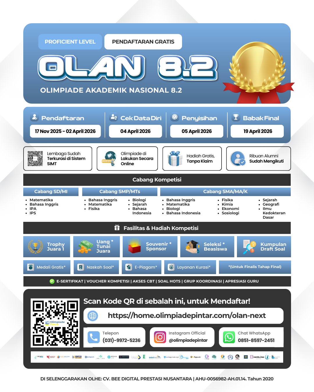 OLAN 8.2 hadir kembali sebagai panggung kompetisi akademik tingkat Proficient yang diselenggarakan oleh CV. Bee Digital Prestasi Nusantara. Ajang ini ditujukan bagi pelajar terpilih yang ingin mengukir prestasi dan masuk dalam talenta nasional SIMT Puspresnas.