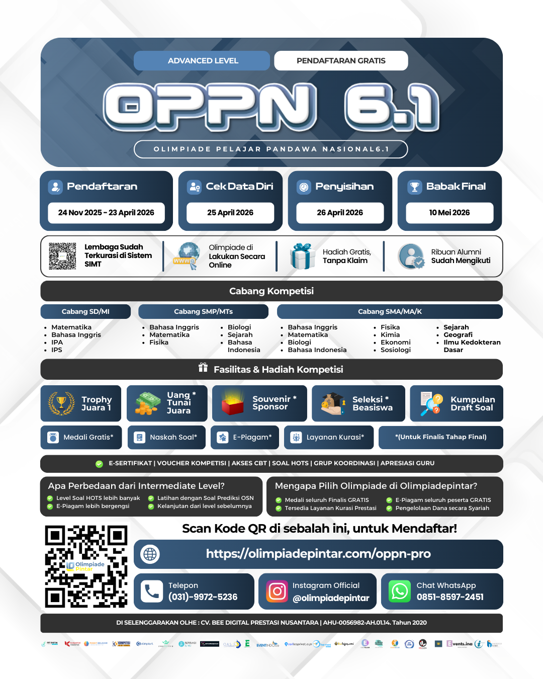 CV. Bee Digital Prestasi Nusantara kembali menghadirkan OPPN 6.1, ajang kompetisi akademik tingkat Advanced yang ditujukan bagi pelajar terpilih untuk membuktikan kemampuan akademik sekaligus meraih pengakuan prestasi nasional melalui SIMT Puspresnas.
