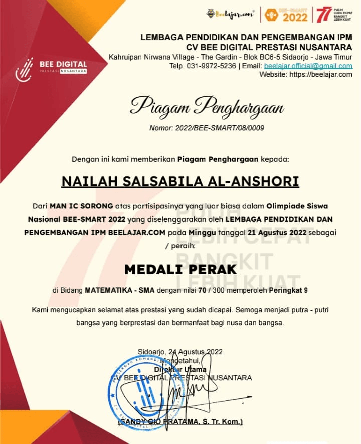 Siswa dari MAN IC Sorong berhasil juarai BEE-SMART 2022 dan meraih medali perak dalam olimpiade tersebut. Olimpiade ini diakan oleh Lembaga Pendidikan dan Pengembangan IPM CV. BEE DIGITAL PRESTASI NUSANTARA. Postingan tersebut dibagikan dihalaman Facebook resmi sekolah mereka pada tanggal 27 Agustus 2022.